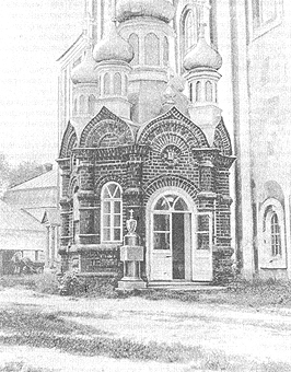 На снимке: часовня над могилой о. Феодора (И. И. Ушакова), настоятеля обители. Слева у входа - памятник на могиле Ф. Ф. Ушакова. Снимок 1912 г.
