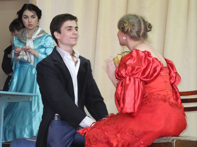 Драма с печальным концом - «Гроза» А. Н. Островского. Отрывок, когда Тихон (П. Уразов) уезжает, а, по сути, сбегает от маменьки (М. Диткина), бросая свою молодую жену Катерину (А. Коршунова) на растерзание Кабанихи, десятиклассники сыграли великолепно. Малодушный Тихон, думающий только о себе, доведенная до отчаяния Катерина, властная и упивающаяся своей властью хозяйка поместья Кабанова – все получилось. Им помогали прислуга в барском доме Глаша (Е. Рыскина) и сестра Тихона - Варвара (М. Пряхина).