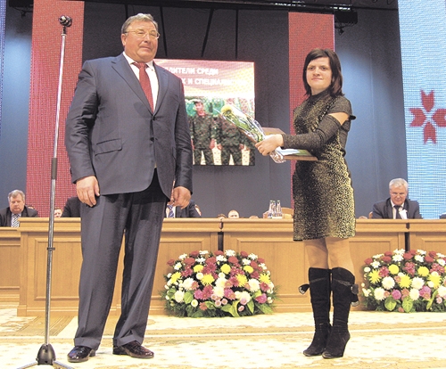 На снимке: Диплом «За победу в республиканском трудовом соперничестве среди молодежи» и денежную премию Носаревой Екатерине Владимировне - оператору машинного доения ООО «Аксел» - вручает Глава Республики Мордовия В. Д. Волков