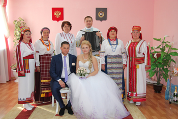 Все основное действо происходило на площадке перед Дворцом бракосочетания, где молодых хлебом-солью встретили самодеятельные артисты районного Дома культуры. Одетые в красочные костюмы, с мордовской песней на устах, они закружили влюбленных в хороводе. Специально для них артисты исполнили несколько обрядовых песен с пожеланиями мира, добра и благополучия новой семье. А затем проводили пару до зала бракосочетания. Здесь их встретили работники ЗАГСа, которые поздравили молодых со знаменательным событием в их жизни, при этом отметили высокую значимость института семьи. Далее последовала торжественная регистрация брака.