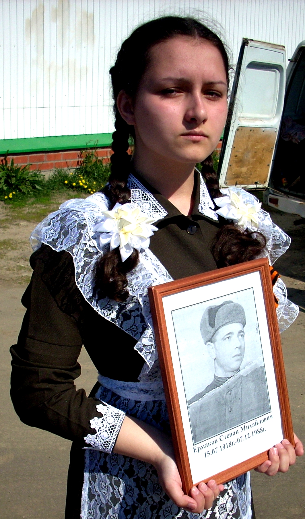 Девятиклассница Наташа Муклецова с гордостью держит портрет своего деда Михаила Николаевича Муклецова.