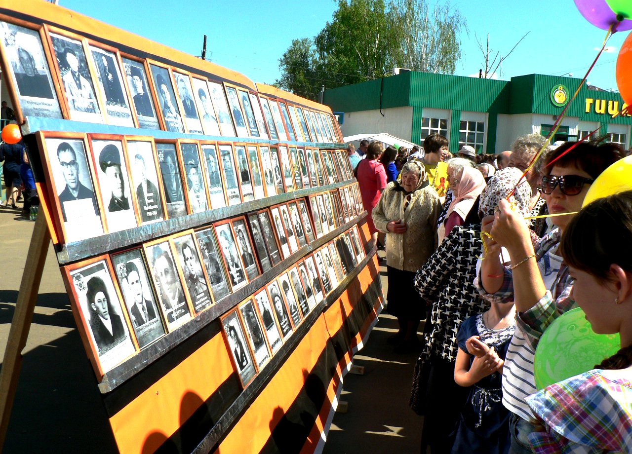 Оттуда коллективы организаций и предприятий под мелодии песен военной поры с цветами и шарами шли колонной по центральной улице к памятнику воинам-землякам, где на гранитных плитах высечены имена их родственников-героев, погибших на полях сражений. Шли, чтобы отдать дань памяти и уважения, прикоснуться к ним душой и сердцем, на минуту представить живыми близких – отцов, дедов, прадедов. Многие в колоннах подпевали, плакали…