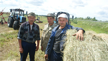 Кормозаготовители КФХ «Горохов», используя погожие солнечные дни, ведут заготовку сена. На поле люцерны, площадью 60 га, слаженно трудится механизированное звено. Бесперебойно обеспечивает фронт работ машинист самоходной косилки С. Хренов. Зеленую массу в валках ворошит тракторист П. Голяйкин. Затем в ход идет пресс-подборщик, которым умело управляет опытный механизатор В. Горбунов. Соблюдая весь технологический процесс, эта бригада качественно заготавливает ценный корм, который впоследствии вывозится под навесы в хранилища. Часть заготовленного сена реализуется населению. На снимке: члены механизированного звена В. Горбунов, П. Голяйкин и С. Хренов.