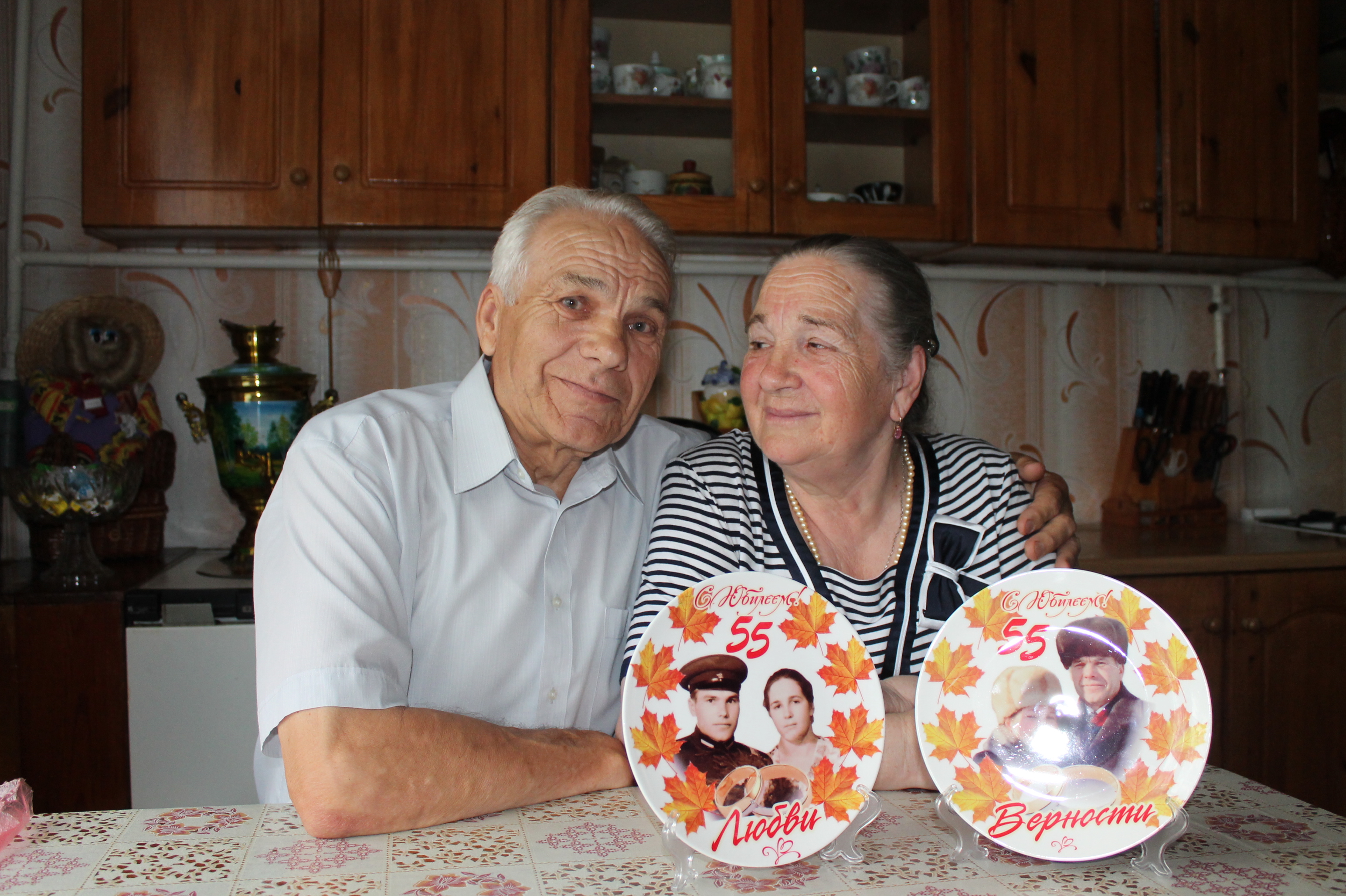 Символичный подарок сделали дети - две красочно оформленные на тарелках фотографии - молодоженов-родителей и сегодняшнего дня с символикой даты. На первой вытиснено слово "Любви", на второй - "Верности". И здесь никакие комментарии не нужны, потому что понятно и просто - семья начинается с любви, а поддерживается верностью. И не год или несколько лет, а вот так, как у Финогеевых - целых 55 лет в любви и верности!