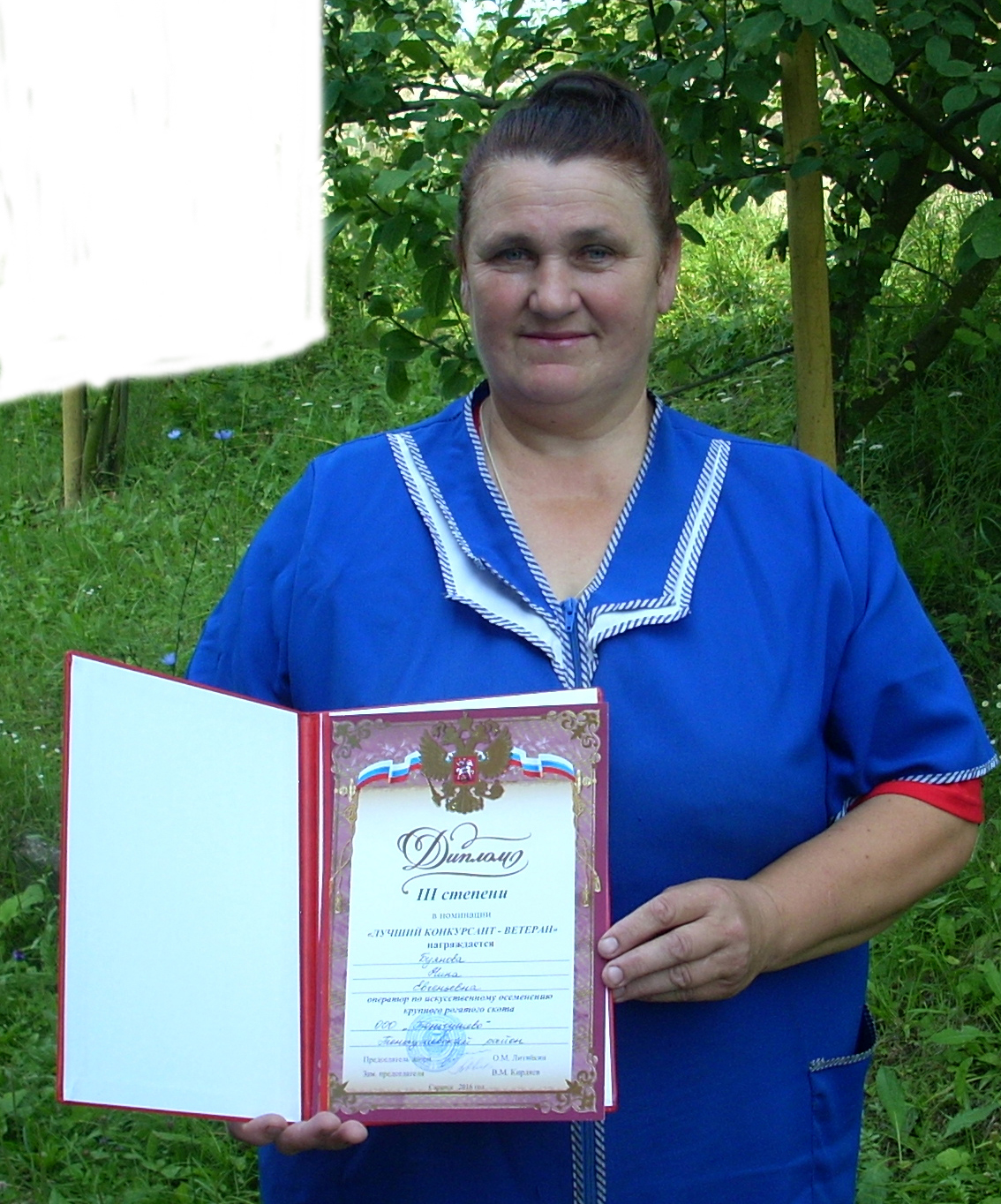 Победительницей в номинации «Ветераны сельхозпроизводства» республиканского конкурса техников-осеменаторов стала Н. Е. Буянова