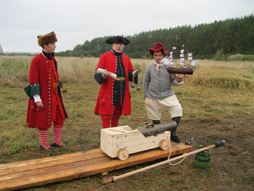 В минувшие понедельник и вторник в районе около деревни Чижиково на живописном фоне корабельных сосен Емашевской рощи гремели пушечные выстрелы. Съемочная группа реконструировала фрагменты боевых действий, когда артиллеристы поражали мишени из настоящей пушки. Они «стреляли по противнику» крупной картечью, ядрами, книппелями. Рассказывая на камеру о происходящем, для полноты восприятия демонстрировали макет корабля, на котором служил Ф. Ф. Ушаков. И если стрелять с земли актерам-морякам было привычно, то выполнять те же действия на качелях оказалось очень сложно. Именно так Ф. Ф. Ушаков готовил моряков к грядущим сражениям: будущие герои-моряки на качелях, как на ускользающей из-под ног палубе, оттачивали мастерство, набирались опыта.