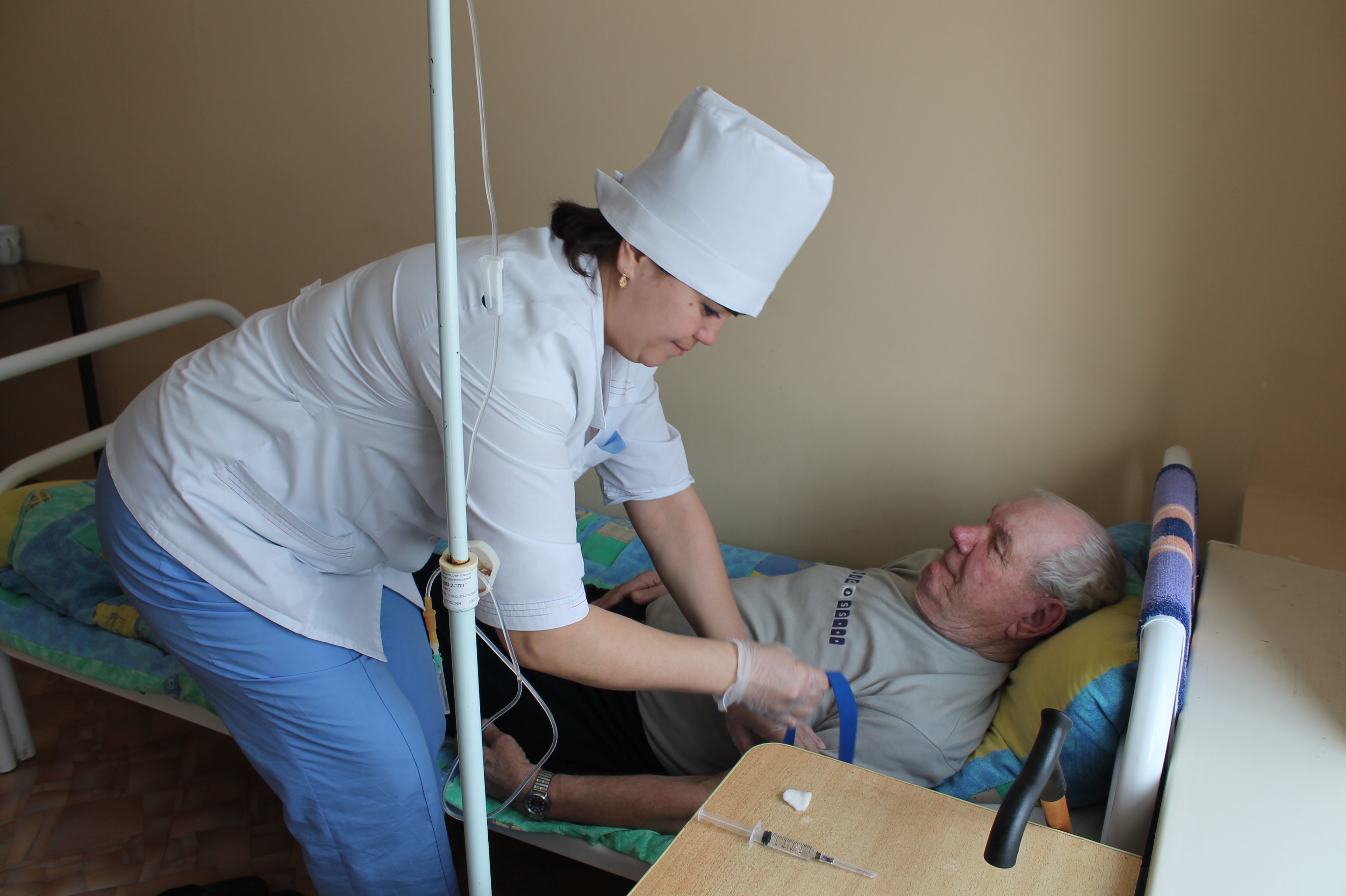 А том, как отделение работает, рассказала и показала старшая медсестра Светлана Александровна Булаева. Паллиативная помощь больным – это не совсем дневное отделение. Это способ помочь тяжелобольным и хроникам достойно пережить стадию обострения. Работает 15 круглосуточных коек. Пациенты отделения – хроники, страдающие экстрактивной формой бронхита, с заболеванием онкологического характера, патологией сосудов… На сегодня все койки заняты. Поступили сюда больные не только из Кадошкинского, но и Ковылкинского районов. Палаты только двухместные и одноместные. Практически в каждой палате холодильник, обязательно раковина, туалетная комната. Больные чаще всего со своей сменной одеждой приходят, предметами гигиены, но если нет, то поликлиника обеспечивает больных и пижамами, и полотенцами. Приветствуется добровольный уход за больными родственников. И для них здесь тоже созданы условия. Наладилось и обеспечение питанием, оно трехразовое. Готовят по утвержденному меню повара кафе «Лагуна». Питание сбалансированное - диетический и общий стол. Согласно предписанию лечащего врача. Что касается медицинского персонала, то он подобран из медицинских работников, имеющих большой стаж работы в отрасли – Н.Х. Арюкова, С.Р. Хансвярова, Г.В. Касьянова и Р.А. Альмяшева. За чистотой здесь следят два работника – санитарки Е.А. Тюпина и О.Н. Юнязова. - Мы лечимся здесь впервые, - рассказывает О.П. Давыданова. – И очень всем довольны – питание прекрасное, вкусно все. Удобства все рядом, чистенько и тепло в палатах. Лечимся здесь с супругом – А.И. Давыдановым. Нашу палату окрестили «семейной». Пользуясь случаем, хочу поблагодарить медперсонал отделения – люди все чуткие и внимательные, голос не повысят. Все с улыбкой, успокаивающе. Больные здесь действительно тяжелые, хронические в том числе. Мы наблюдаемся у невропатолога Е.А. Межновой. Всегда посоветует, выслушает, спросит. Хорошо, что открыли такое отделение. И главное, мы, кадошкинцы, у себя дома, в своей больнице можем пройти курс лечения. Присоединилась к разговору Г.П. Дорощук. Она в тот момент ухаживала за тяжелобольным родственником. Галина Петровна выразила благодарность всем работникам отделения – очень добросовестно они относятся к больным. Сострадательно. И действительно, для ухаживающих созданы условия проживания. Медики медиками, они хоть и профессионально все делают, не поспоришь, а родные руки и лучше, и надежнее. Медики обучают ухаживающих как правильно вести себя с больным, технике ухода, гигиены.