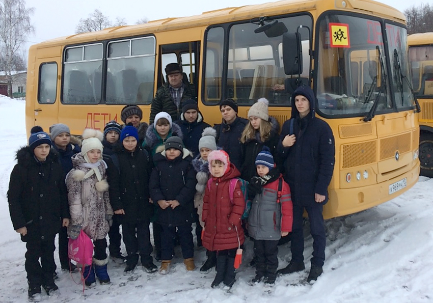На снимке: конец маршрута. Дети доставлены к школе. Новым автобусом ПАЗ управляет опытный водитель А. А. Комаров