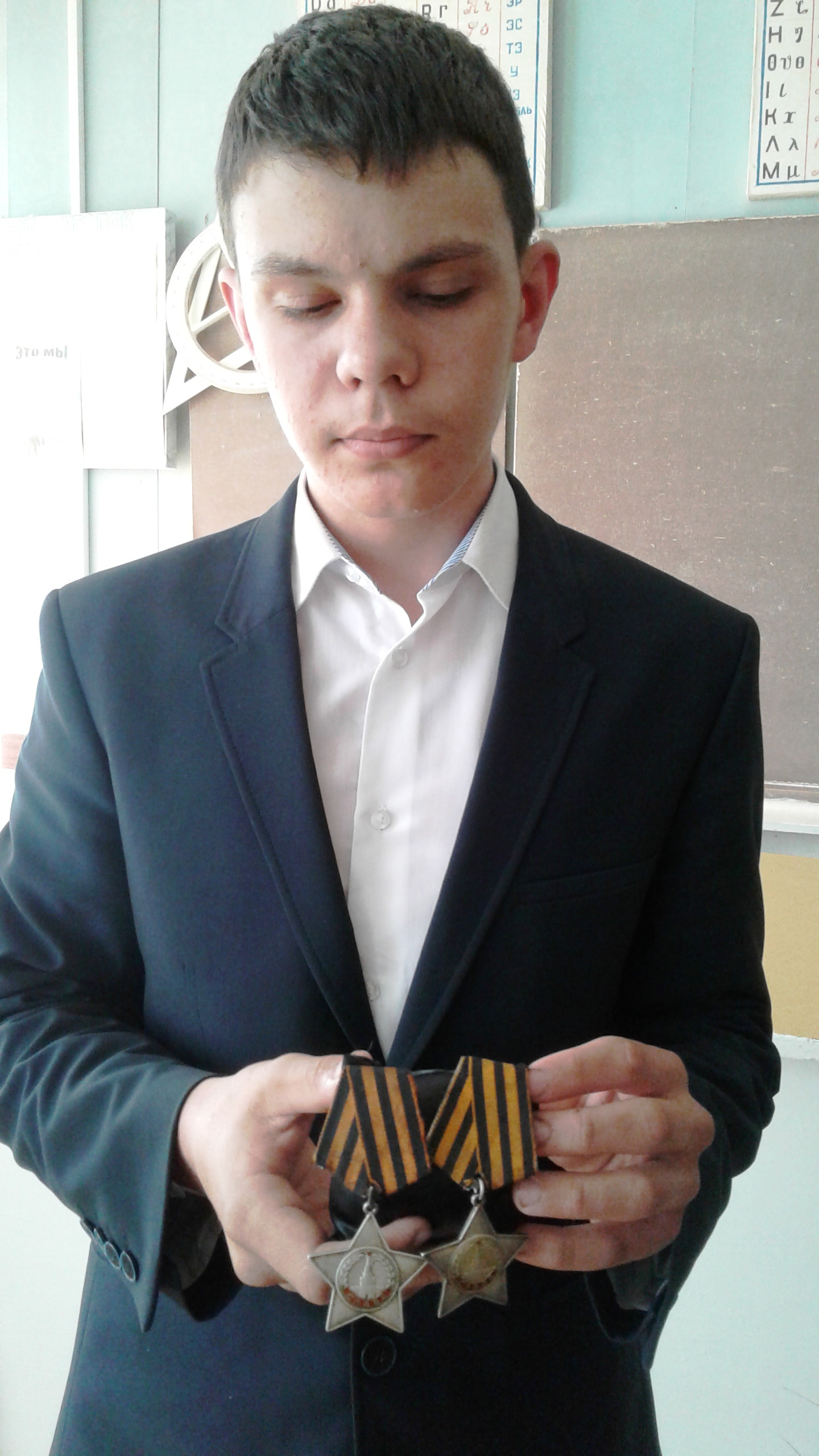 На снимке: Бауков Артем с орденами Славы II и III степени прадеда Баукова Павла Семеновича