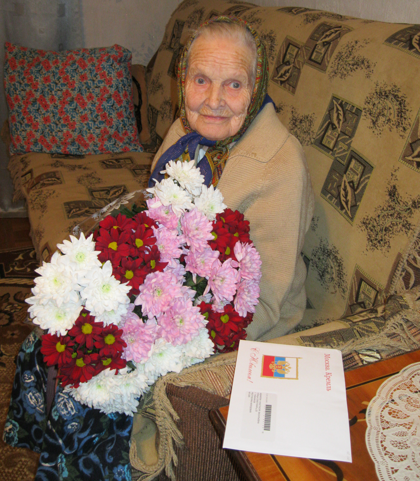 Эти слова вместе с руководителем соцзащиты населения Л. И. Таракиной и заместителем главы Темниковского городского поселения Д. Ф. Игоновым я услышала в момент, когда они вручали юбиляру Приветственный адрес от В. В. Путина по случаю ее большого юбилея. Сколько было радости и счастья в глазах пожилого человека от такого уважения и заботы! Она попросила открыть конверт с надписью: «Москва. Кремль» и прочесть текст поздравления, ведь строки о том, что поколение победителей, ее поколение, с честью прошло через тяжелейшие испытания войной, своим трудом создавая богатство и мощь страны, - это про нее!