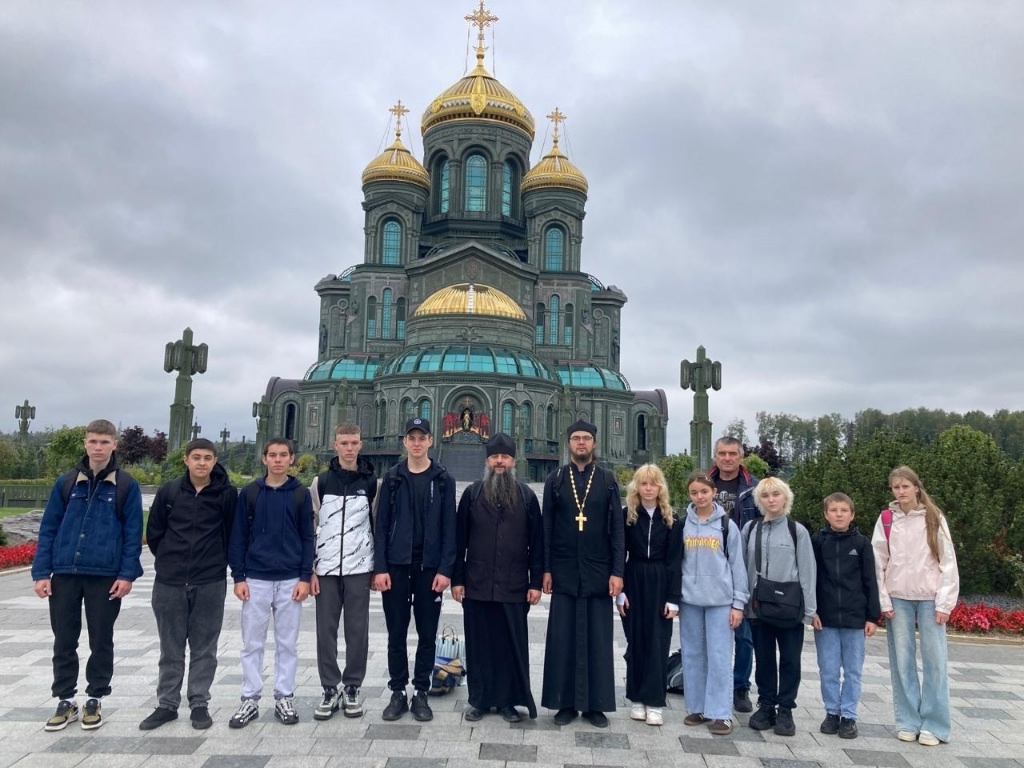 В сентябре 2025 года воспитанники Дракинской Воскресной школы под руководством председателя отдела религиозного образования и катехизации Краснослободской епархии игумена Амфилохия в очередной раз побывали в увлекательной поездке, которая стала для них путешествием по городу Москва. Маршрут открыл Главный Храм Вооруженных сил Российской Федерации, расположенный в подмосковной Кубинке на территории военного парка «Патриот». Возведенный архитектурный ансамбль относится к мемориальным комплексам и включает Патриарший собор во имя Воскресения Христова с галереей «Дорога памяти». Это не просто эпическое религиозное сооружение, а место, где воедино сплелись отечественная история, православная культура, искусство, дающие посыл к важнейшим моментам воинской и духовной летописи нашей страны. Скульптурные композиции и горельефы на фасадах поведали ребятам о личностях, сыгравших важную роль в судьбе Отечества. Познакомили с героями крымской, русско – турецкой, Великой Отечественной войн.