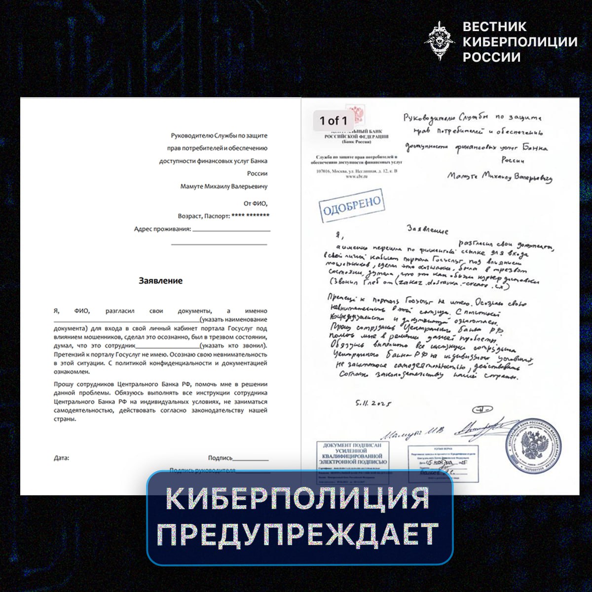 Как это работает: Вам звонят, представляясь «сотрудником Банка России», «специалистом по защите прав потребителей» или «уполномоченным представителем ЦБ», звонящий сообщает о «подозрительной активности»: якобы кто-то пытался получить доступ к вашему аккаунту на Госуслугах, банковскому счёту или персональным данным. Внушают, что ваши счета вот-вот заблокируют, деньги пропадут, а вы сами можете быть включены в список «риска» Росфинмониторинга. Чтобы «спасти ситуацию», предлагают подключиться к секретной программе ИПБС — якобы «единственному способу» защитить свои активы. Далее вас просят подписать заявление, в котором вы: Признаёте свою «вину»; Просите «помощи от ЦБ»; Обещаете «выполнять все инструкции» и «не заниматься самодеятельностью». Это может создать у вас иллюзию юридической ответственности за свои действия и легитимности процесса. После «оформления участия в программе» мошенник: Требуют указать все установленные банковские приложения и перевести деньги на безопасный счет. Банк России не работает напрямую с физическими лицами как банк ЦБ РФ — это государственный регулятор. Он контролирует деятельность банков, страховых компаний, МФО и других финансовых организаций, но не оказывает гражданам персональные банковские или юридические услуги. У него нет «программ сопровождения» для частных лиц, он не назначает «уполномоченных представителей» для работы с вами лично и не заключает с вами индивидуальных договоров. Такой «ИПБС» не существует в правовом поле РФ Ни в законодательстве, ни на официальном сайте Банка России (cbr.ru ) вы не найдёте упоминаний об «Индивидуальной программе банковской сопровождаемости». Это название — вымышленное. ЦБ не налагает штрафы на граждан и не блокирует счета напрямую В документе говорится о штрафе в 250 000 рублей «в бесспорном порядке» и о блокировке счетов «по ФЗ-161». На самом деле ФЗ-161 регулирует национальную платёжную систему, а решения о блокировке счетов принимают банки или суды, не ЦБ. Штрафы же взыскиваются только по решению суда или налоговыми органами — и никогда «за разглашение участия в программе». Заявление о «разглашении данных Госуслуг» — манипулятивный приём Формулировка «я разгласил документы под влиянием мошенников» может выглядеть как признание вины, но на деле оно не имеет юридической силы и не требуется ни Банку России, ни порталу Госуслуг. Такие заявления используются, чтобы вызвать у человека тревогу и подтолкнуть его к дальнейшим действиям по инструкции. Официальные документы ЦБ не выглядят так Настоящие нормативные акты Банка России публикуются на его сайте с чёткой структурой, номерами, датами, подписями должностных лиц и ссылками на законодательство. В них никогда не будет требований «не заниматься самодеятельностью» или «действовать строго по инструкциям назначенного сотрудника». Если вам прислали подобные документы — не выполняйте указания из них. Лучшая защита — спокойствие, внимательность и обращение только по официальным каналам: Горячая линия Банка России — 8 800 300-30-00 Официальный сайт — cbr.ru Подписаться на Киберполицию РоссииMax I ВK I ОKЧат-бот Киберполиции России