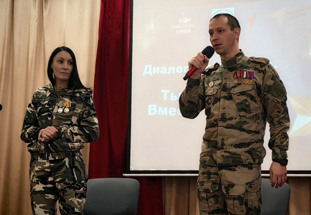 Школьники, их родители, учителя общались с участниками СВО Денисом Салдатовым и Региной Аббазовой, которые простыми, понятными всем словами говорили о том, что такое Родина и почему они оказались в числе защитников интересов Отчизны после объявления Президентом России В. В. Путиным специальной военной операции.