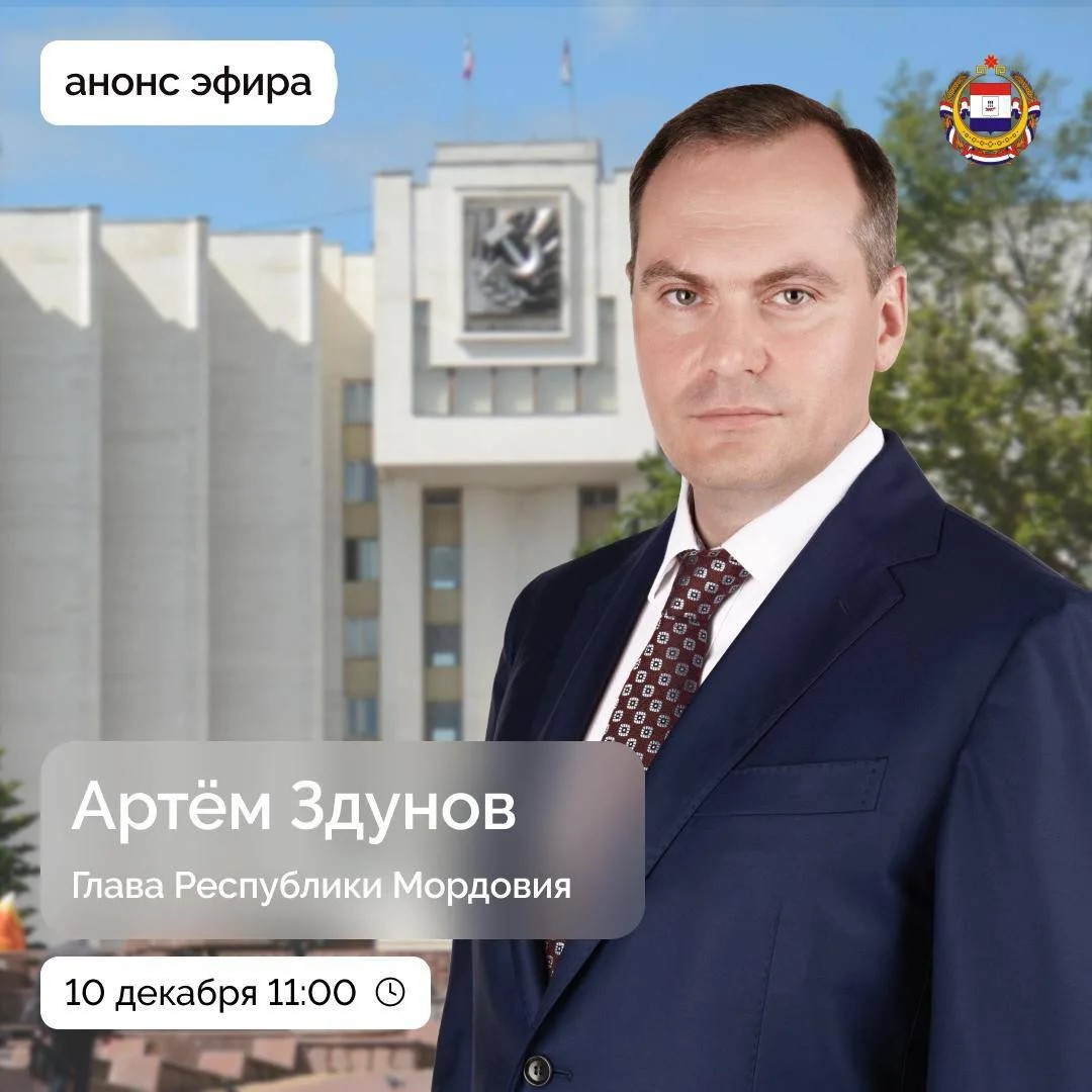 Прямой эфир с Главой Республики Мордовия Артёмом Здуновым на площадке «Республики Мордовия» ВКонтакте. 10 декабря в 11:00 Задать вопросы вы можете: - в комментариях под постом прямого эфира, - на страницах Главы РМ Артёма Здунова в VK и OK, - на Госуслугах по ссылке vk.cc/cRTmxz, - а также во время прямого эфира. Прямой эфир пройдёт при поддержке ЦУР РМ. #ПрямойЭфир