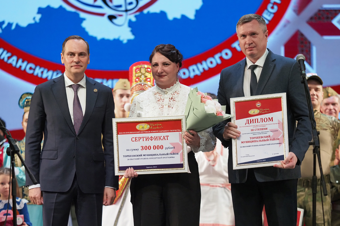 Участников и зрителей в этот день приветствовал Глава Мордовии Артём Здунов. На торжественной церемонии награждения в номинации «Муниципальные образования с численностью населения свыше 10000 человек» Диплом лауреата III степени и сертификат на 300 тысяч рублей был присужден творческим коллективам Торбеевского муниципального района. Артём Алексеевич вручил награды главе района Сергею Шичкину и заместителю начальника управления по социальной работе администрации Торбеевского муниципального района Марии Есяковой (на снимке).