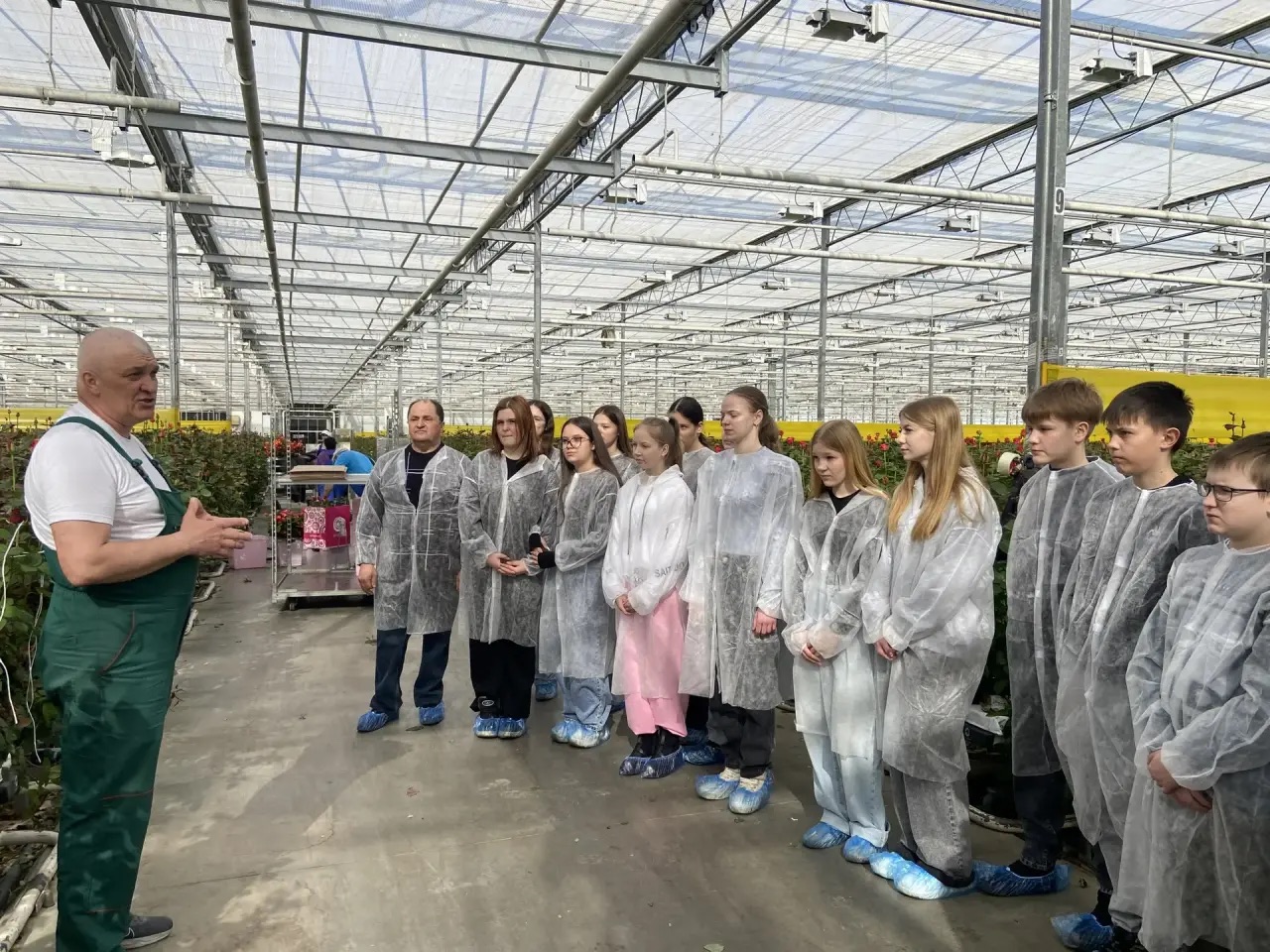 Для ребят распахнул двери мир высоких технологий в цветоводстве. Экскурсию провел главный агроном Сергей Петрович Юдаев. Школьники не только увидели масштабы производства, ведь розы занимают почти 6 гектаров, но и узнали множество секретов профессионального выращивания цветов. Сергей Петрович подробно рассказал о тонкостях системы подкормок, благодаря которым розы растут крепкими и здоровыми, а также о важной роли досвечивания в любое время года.